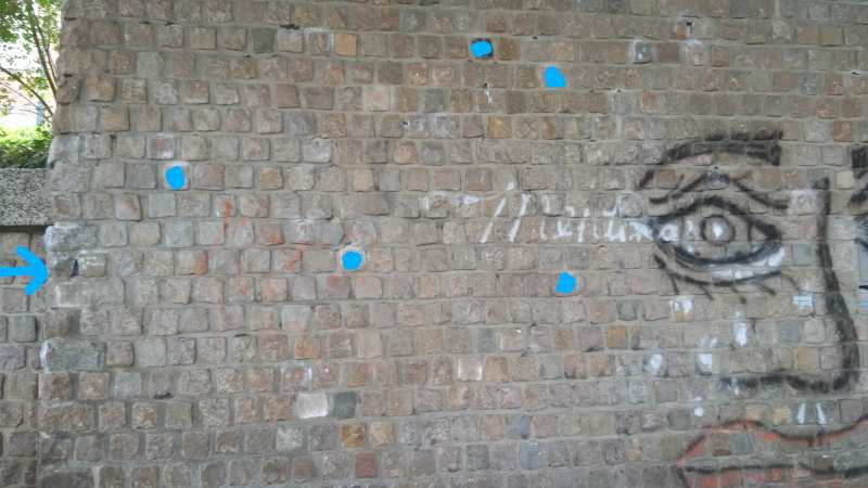 Helemaal rechts om de hoek langs de struiken is de sector 'Famous when you're dead'. Hier lopen nog weinig routes. Het eerste stuk is flink hoog. Verder langs het taluud omhoog wordt de wand doorsneden door nog twee spleetroutes. Daarna wordt de wand al snel lager.